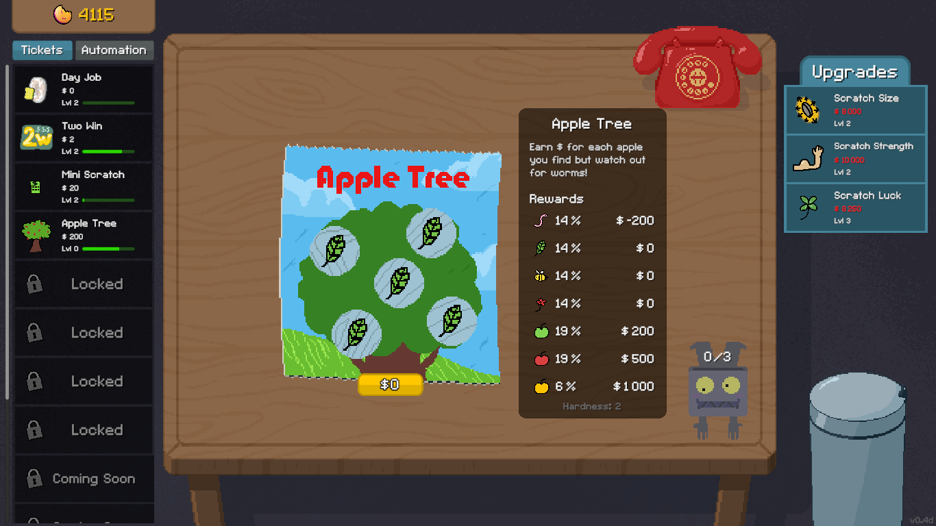 I found a couple of problems with the game. such as when you go into debt from scratching you can't wash dishes so you get hardlocked and one of the reasons why you cannot select the whole stack of scratched cards from the auto scratcher is because every time one is finished it makes you click on the stack again.