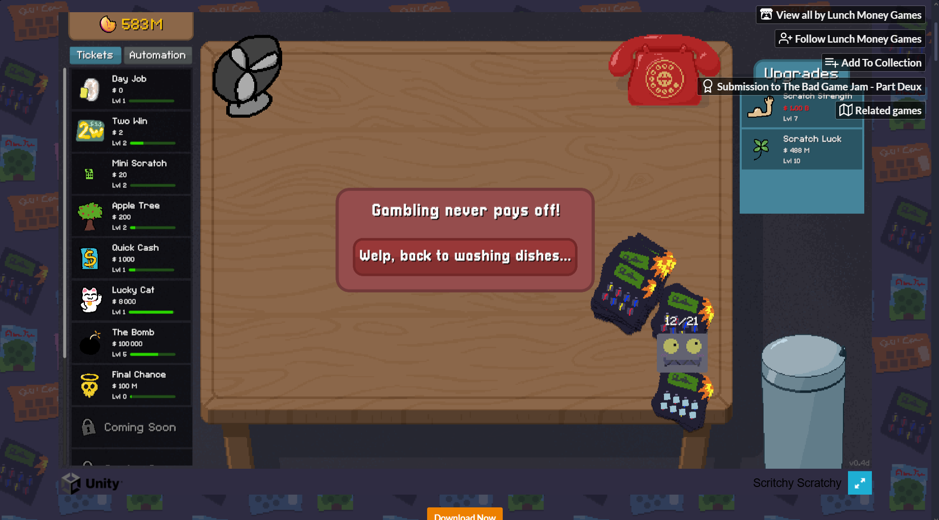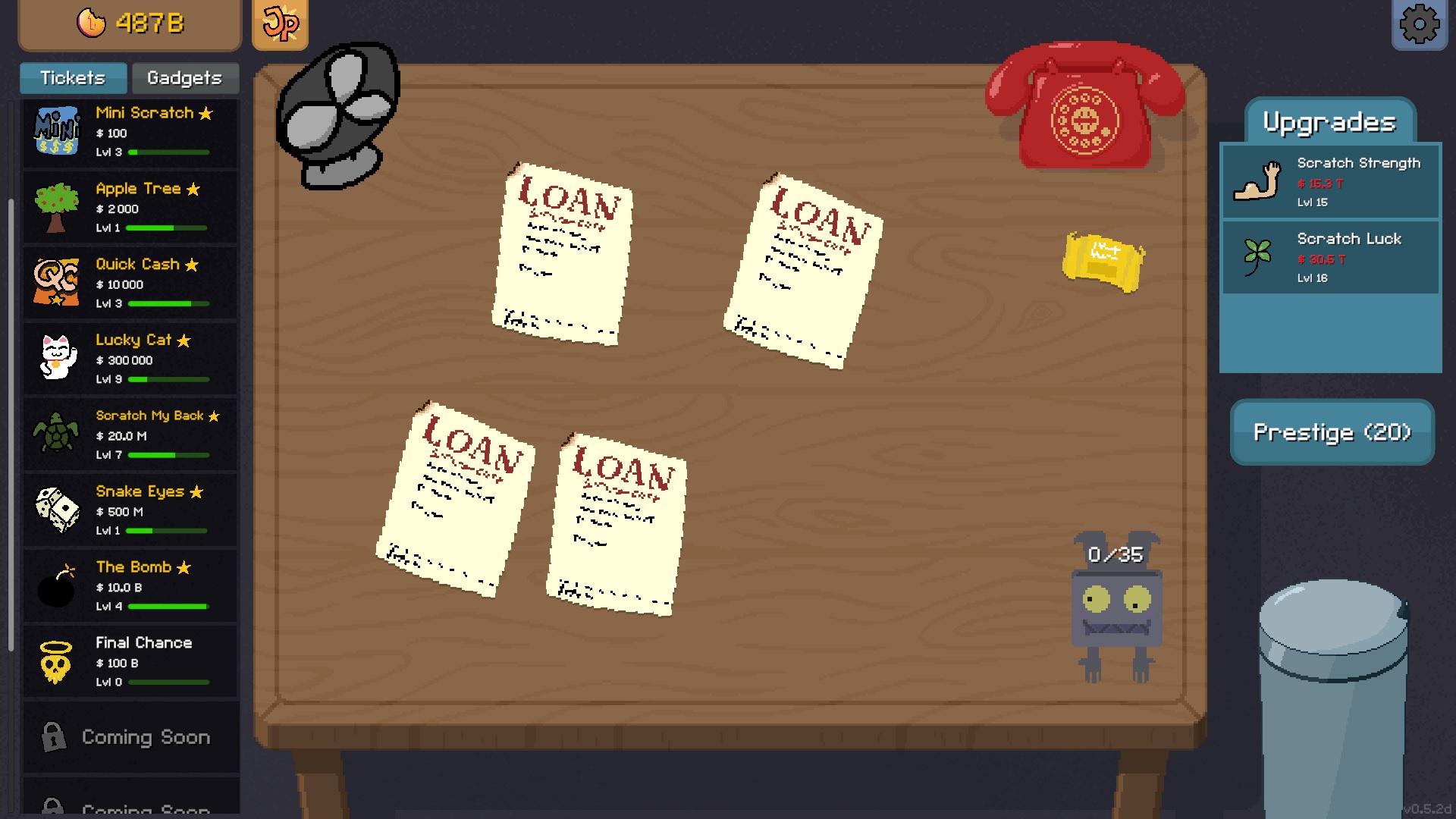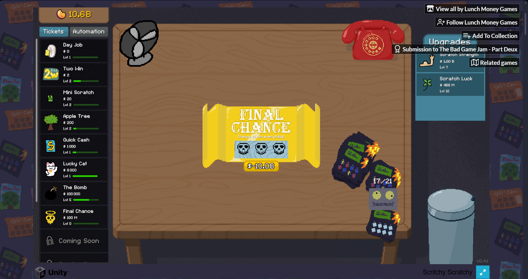 This can easily put you into debt if you aren't mindful about your luck, upgrades, or what type of card you select. So I think it'd be an interesting addition, both for automating your scratch-off process and getting unmindful players into bankruptcy. Assuming, loans ever become more than a consequenceless safety net.